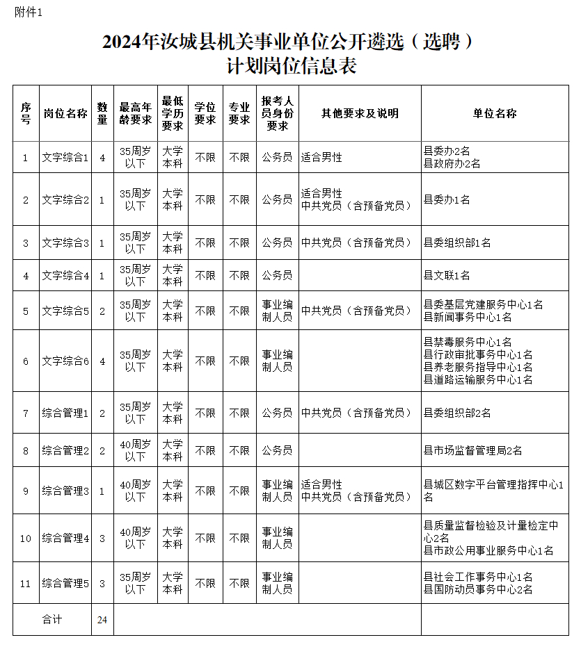 附件:1.2024年汝城縣機關(guān)事業(yè)單位公開遴選(選聘)計劃崗位信息表