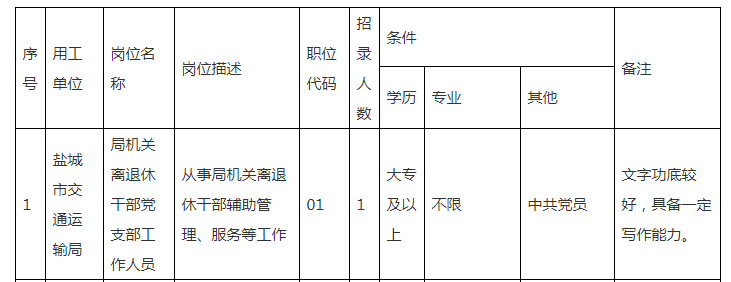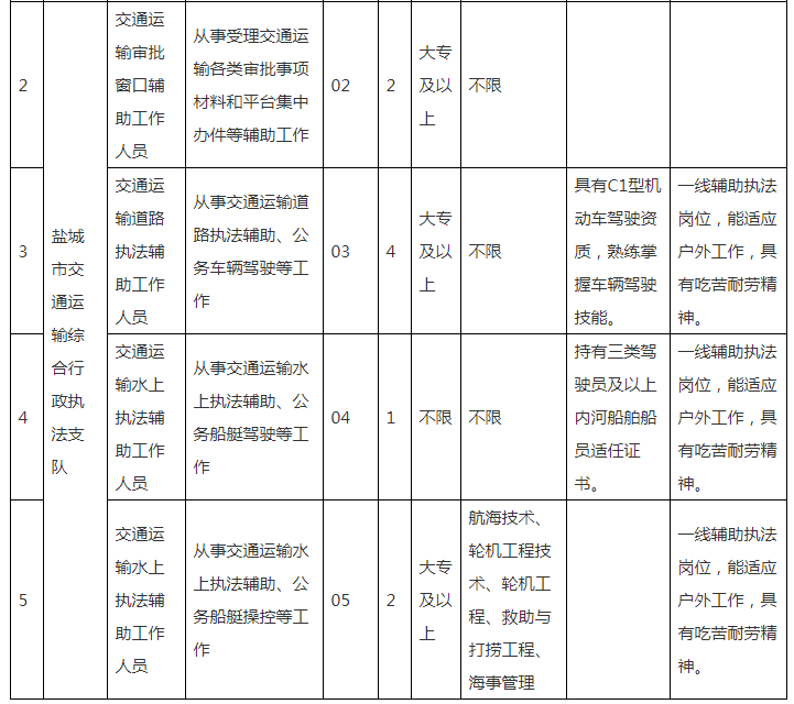 鹽城市交通運(yùn)輸局及其所屬支隊(duì)2024年公開招錄政府購買服務(wù)用工人員崗位表: