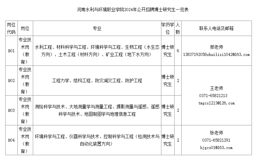 詳見附表《河南水利與環(huán)境職業(yè)學(xué)院2024年公開招聘博士研究生一覽表》。