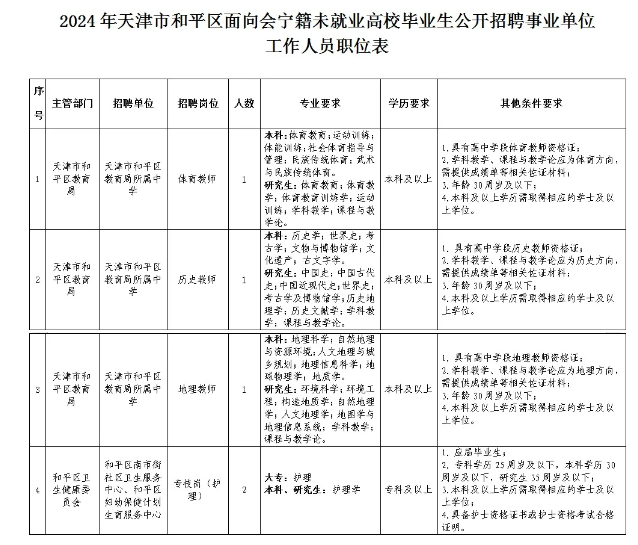 ?。ㄋ模┢渌麠l件詳見(jiàn)《2024年天津市和平區(qū)面向會(huì)寧籍未就業(yè)高校畢業(yè)生公開(kāi)招聘事業(yè)單位工作人員職位表》。