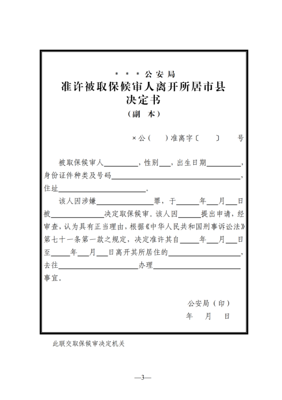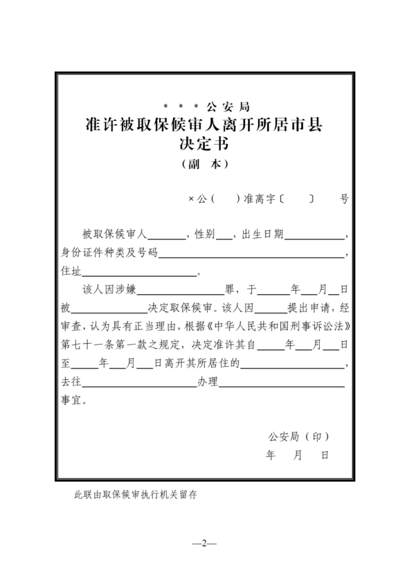 2.被取保候?qū)徣诵枰x開所居住的市、縣的,應(yīng)當(dāng)向負(fù)責(zé)執(zhí)行的派出所提出書面申請(qǐng),并注明事由、目的地、路線、交通方式、往返日期、聯(lián)系方式等。被取保候?qū)徣擞芯o急事由,來不及提出書面申請(qǐng)的,可以先通過電話、短信等方式提出申請(qǐng),并及時(shí)補(bǔ)辦書面申請(qǐng)手續(xù)。經(jīng)審查,具有工作、學(xué)習(xí)、就醫(yī)等正當(dāng)合理事由的,由派出所負(fù)責(zé)人批準(zhǔn)。