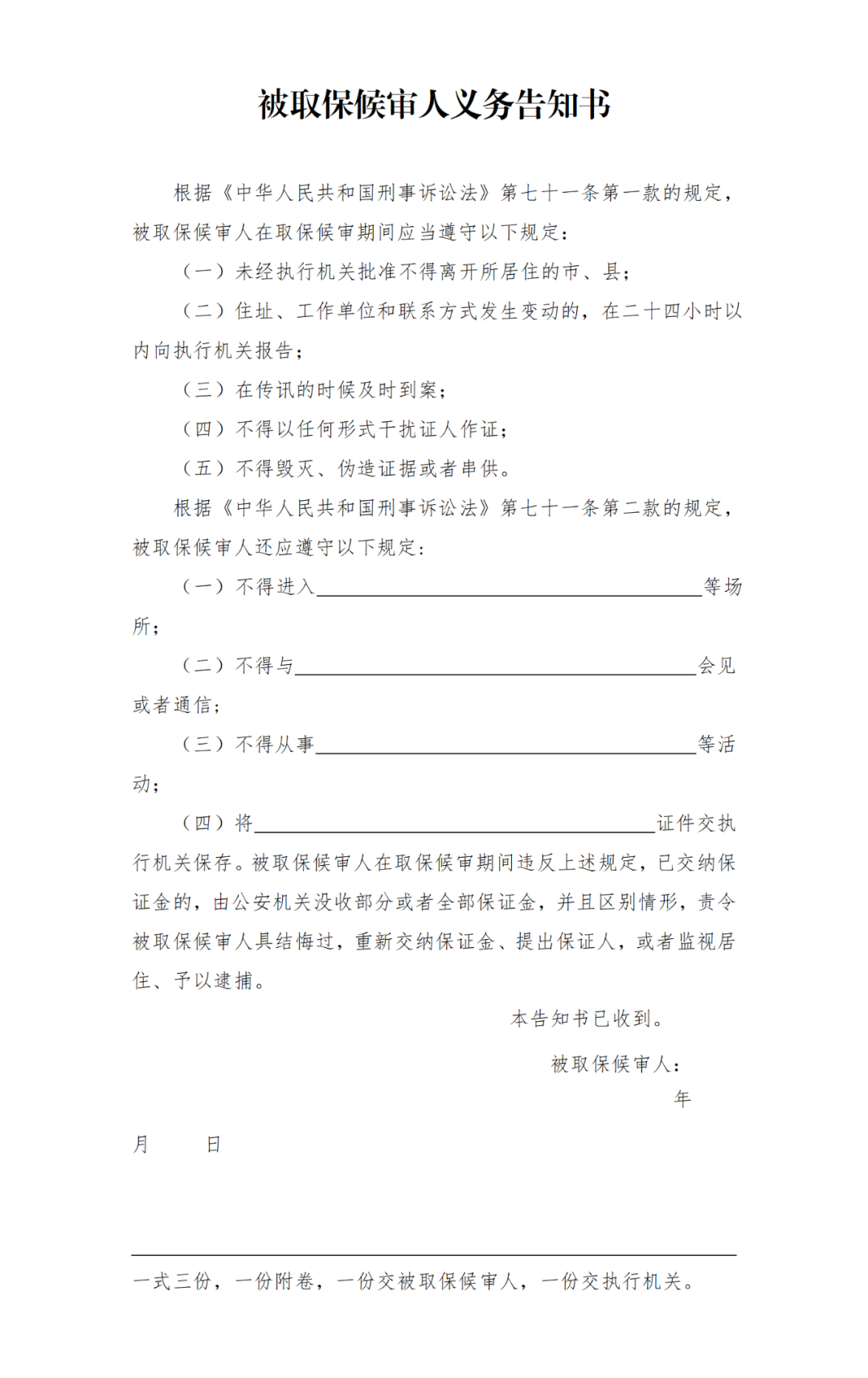 1.執(zhí)行機(jī)關(guān)在執(zhí)行取保候?qū)彆r(shí),應(yīng)當(dāng)告知被取保候?qū)徣吮仨氉袷匦淌略V訟法第七十一條的規(guī)定,以及違反規(guī)定或者在取保候?qū)徠陂g重新犯罪的法律后果。