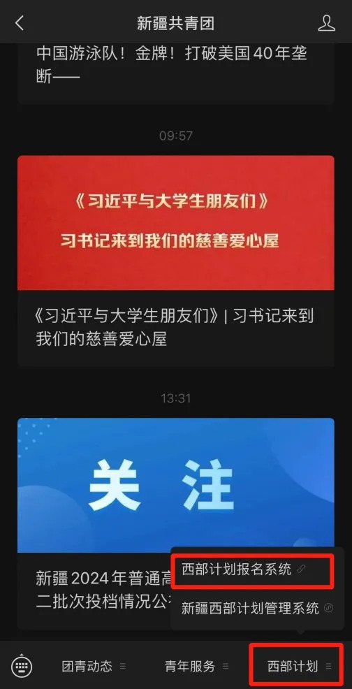 第一步:符合報名要求人員進入“新疆共青團”微信公眾號菜單欄,選擇“西部計劃”中的“西部計劃報名系統(tǒng)”,即可跳轉報名官網(wǎng)鏈接或登錄西部計劃官網(wǎng)(http://xibu.youth.cn),在西部計劃報名系統(tǒng)中進行注冊報名;