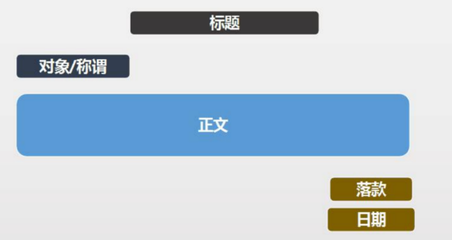 在圖片上,我們可以清晰地看到應(yīng)用文的格式包括五個(gè)要素:一是標(biāo)題,位置需要居中,也就是前后空格一樣多;二是對(duì)象,位置需要另起一行頂格寫(xiě),表明該篇應(yīng)用文是發(fā)給哪個(gè)單位的;三是正文,向發(fā)文對(duì)象闡明發(fā)文的目的和要求,該部分內(nèi)容要符合“工作目標(biāo)”;四是落款,位置靠右,表明發(fā)文單位;五是日期,位置靠右,與上一行的“落款”對(duì)齊。