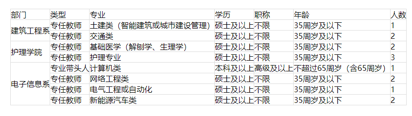 1、專業(yè)、學(xué)歷、職稱條件詳見表格,有職稱、教學(xué)經(jīng)驗(yàn)或有企業(yè)工作經(jīng)歷并取得職業(yè)資格證書者優(yōu)先。