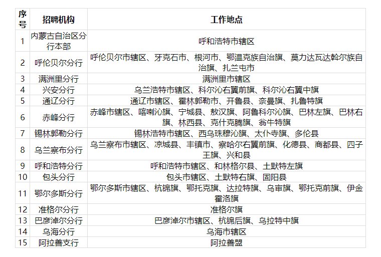 3.大學生村官及“三支一扶”人員專項報名通道主要面向以下機構(gòu)開放:呼倫貝爾分行轄內(nèi)牙克石、根河、伊敏、大雁、莫力達瓦達斡爾族自治旗、鄂溫克族自治旗、扎蘭屯支行,興安分行轄內(nèi)科爾沁右翼前旗、科爾沁右翼中旗支行,通遼分行轄內(nèi)霍林郭勒、開魯縣、奈曼旗(籌建)、扎魯特旗支行,赤峰分行轄內(nèi)喀喇沁旗、寧城、敖漢、阿魯科爾沁旗、巴林左旗、巴林右旗、林西、克什克騰旗、翁牛特旗支行,錫林郭勒分行轄內(nèi)西烏珠穆沁旗、太仆寺旗、多倫支行,烏蘭察布分行轄內(nèi)涼城、豐鎮(zhèn)、察哈爾右翼前旗、化德、商都、四子王旗(籌建)、興和支行,呼和浩特分行轄內(nèi)和林格爾、土默特左旗支行,包頭分行轄內(nèi)土默特右旗、固陽支行,鄂爾多斯分行轄內(nèi)杭錦旗、鄂托克旗、達拉特旗、烏審旗、鄂托克前旗、伊金霍洛旗、棋盤井工業(yè)園區(qū)支行,巴彥淖爾分行轄內(nèi)杭錦后旗、烏拉特中旗支行。