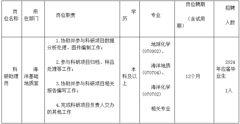 根據(jù)工作需要,自然資源部中國(guó)地質(zhì)調(diào)查局青島海洋地質(zhì)研究所招聘科研助理1名,有關(guān)招聘事宜公告如下。