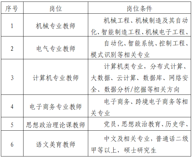 5.專任教師崗具有崗位所需專業(yè)或技能條件,具有高校教學(xué)經(jīng)驗(yàn)、中級(jí)以上專業(yè)技術(shù)職務(wù)或具有行業(yè)、企業(yè)工作經(jīng)歷優(yōu)先考慮,條件可適當(dāng)放寬;