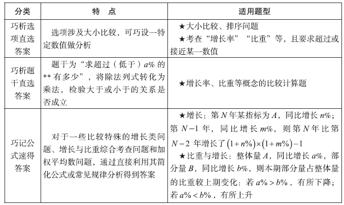 資料分析解題一般思路:閱讀材料(標(biāo)記關(guān)鍵詞)、閱讀題干(識別題型)、定位數(shù)據(jù)、綜合考點(diǎn)與信息(列出計(jì)算式)、快速分析或估算。