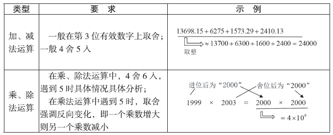 有效數(shù)字法:在計(jì)算多位有效數(shù)字的數(shù)據(jù)時,可將其個位、十位或百位等的數(shù)據(jù)根據(jù)具體情況進(jìn)行舍位,得到相對簡單的數(shù)據(jù),再進(jìn)行計(jì)算。