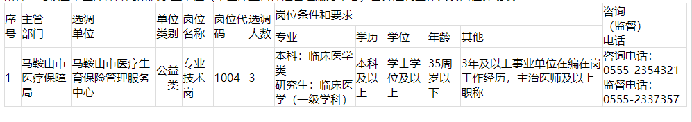 本次計(jì)劃面向全省公開(kāi)選調(diào)事業(yè)單位工作人員3名,具體崗位及選調(diào)資格條件見(jiàn)《馬鞍山市醫(yī)療保障局所屬事業(yè)單位(市醫(yī)療生育保險(xiǎn)管理服務(wù)中心)公開(kāi)選調(diào)工作人員崗位計(jì)劃表》(見(jiàn)附件)。