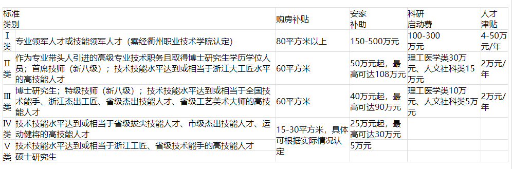 2.招聘對(duì)象按規(guī)定符合衢州市和衢州職業(yè)技術(shù)學(xué)院高層次緊缺人才引進(jìn)相關(guān)待遇(購(gòu)房補(bǔ)貼、安家補(bǔ)助、科研啟動(dòng)費(fèi)、人才津貼等)的,學(xué)校根據(jù)人才類別按規(guī)定幫助其申請(qǐng)市購(gòu)房補(bǔ)貼、人才津貼,并發(fā)放學(xué)校安家補(bǔ)助等,具體標(biāo)準(zhǔn)如下:
