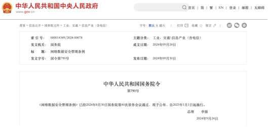 《網(wǎng)絡數(shù)據(jù)安全管理條例》公布,自2025年1月1日起施行。