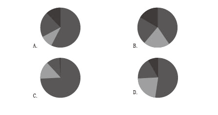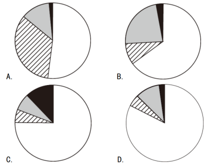 問:以下餅圖中,最能準(zhǔn)確反映2022年S市租賃和商務(wù)服務(wù)業(yè)(白色)、科學(xué)研究和技術(shù)服務(wù)業(yè)(斜線)、信息傳輸軟件和信息技術(shù)服務(wù)業(yè)(黑色)以及其他所有行業(yè)(灰色)實(shí)際使用外資金額占同期S市實(shí)際使用外資金額的比重關(guān)系的是( )。