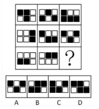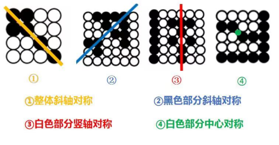 這一類題目大概率會考察對稱、筆畫、部分?jǐn)?shù)、面積等其他規(guī)律。先從“黑白色塊”對稱性的考點(diǎn)來說,可能考察對稱形式(軸對稱、中心對稱)、對稱軸(方向、數(shù)量)等,簡單來說就是把對稱性的很多考點(diǎn)融合到“黑白色塊”的題型中。