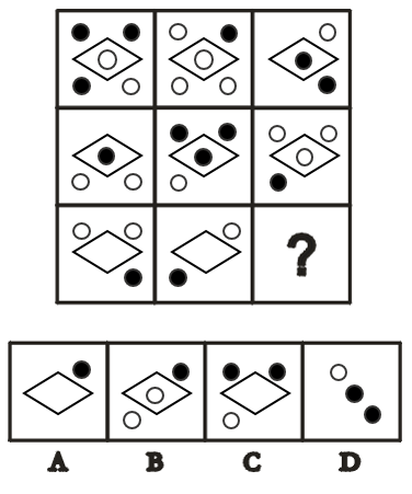 【答案】B【解析】疊加。圖中都出現(xiàn)了黑白球,優(yōu)先考慮黑白球的常考考法,第一個是個數(shù)問題,在第一行圖形中,黑球個數(shù)分別為312,沒有一致規(guī)律,因此也不考慮第一個移動考點(diǎn)。第三個考點(diǎn)是疊加問題,這個題型的疊加是加入了黑白和空格來考察疊加問題。黑加白=空格,黑加黑=白,白加白=黑,黑加白=空格,白加白=黑,空加黑=白,白加空=空。第二行驗(yàn)證的確可行,把它運(yùn)用在第三行。第三行左上位置是白加空=空,先排除CD。左下角位置是空加黑=白。故本題答案為B項(xiàng)。
