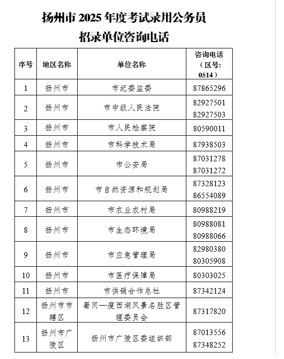 1.揚(yáng)州市2025年度考試錄用公務(wù)員招錄機(jī)關(guān)(單位)咨詢電話