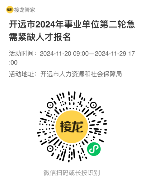 3.報名方式:本次實行網(wǎng)絡(luò)報名,應(yīng)聘人員掃描下方二維碼進行報名,到報名截止時間未完成報名步驟和提供相應(yīng)材料的,視為放棄報名資格,報名過程中如遇到問題可聯(lián)系開遠市人力資源和社會保障局事業(yè)單位管理科,聯(lián)系電話:0873-7236881,郵箱:kyrsjsyk@163.com。
