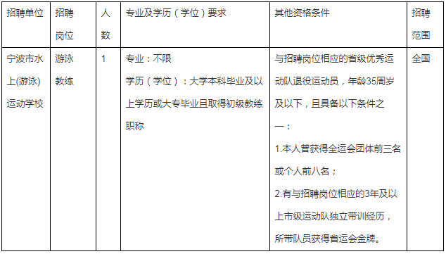 根據(jù)《寧波市事業(yè)單位公開招聘工作人員實(shí)施辦法》的有關(guān)規(guī)定,市體育局直屬單位寧波市水上(游泳)運(yùn)動(dòng)學(xué)校,決定面向社會(huì)公開招聘事業(yè)編制教練員1名?,F(xiàn)就有關(guān)事項(xiàng)公告如下: