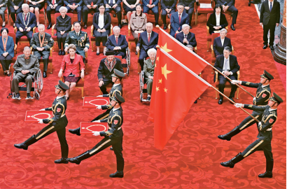 新中國成立75年來,中國共產(chǎn)黨團(tuán)結(jié)帶領(lǐng)全國各族人民,創(chuàng)造了經(jīng)濟(jì)快速發(fā)展和社會長期穩(wěn)定兩大奇跡,中華民族偉大復(fù)興進(jìn)入了不可逆轉(zhuǎn)的歷史進(jìn)程,全黨全國各族人民“四個(gè)自信”明顯增強(qiáng)、精神面貌更加奮發(fā)昂揚(yáng)。2024年9月29日,中華人民共和國國家勛章和國家榮譽(yù)稱號頒授儀式在北京人民大會堂金色大廳隆重舉行。圖為禮兵護(hù)送國家勛章和國家榮譽(yù)稱號獎(jiǎng)?wù)氯雸觥?新華社記者 岳月偉/攝