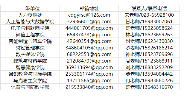 應(yīng)聘人員按要求向意向二級(jí)學(xué)院或人力資源處指定郵箱(見(jiàn)下表)發(fā)送報(bào)考材料完成報(bào)名,具體材料要求詳見(jiàn)《報(bào)考材料清單》(附件3)。