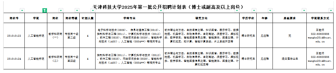 崗位具體要求詳見《天津科技大學2025年第一批公開招聘方案(博士或副高及以上崗位)》