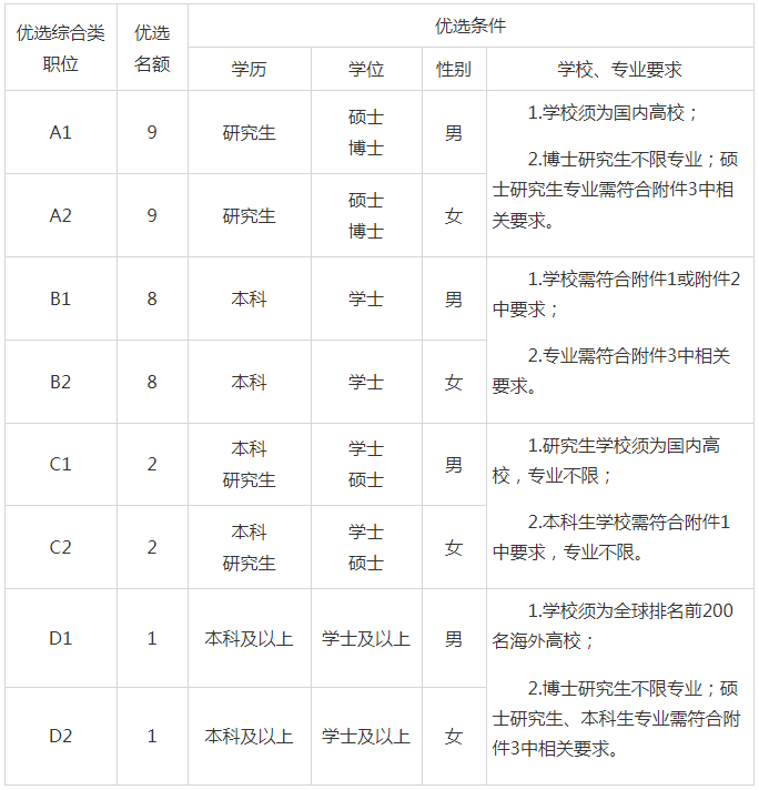 優(yōu)選范圍為國內(nèi)高校中取得全日制研究生學歷、博士學位(以下簡稱博士),取得全日制研究生學歷、碩士學位(以下簡稱碩士);取得147所“雙一流”建設(shè)高校(見附件1)全日制本科學歷、學士學位(以下簡稱本科生)的人員;山東省屬“高水平大學”建設(shè)高校及省屬駐棗高校(見附件2)畢業(yè)的符合條件的全日制4年及以上學制大學本科生;全球排名前200名高校畢業(yè)的博士、碩士和本科生。根據(jù)教育部辦公廳等五部門《關(guān)于進一步做好非全日制研究生就業(yè)工作的通知》(教研廳函〔2019〕1號)規(guī)定,自2017年起,由國家統(tǒng)一下達招生計劃、考試招生執(zhí)行相同政策和標準的非全日制研究生可報考符合條件的相應(yīng)崗位。