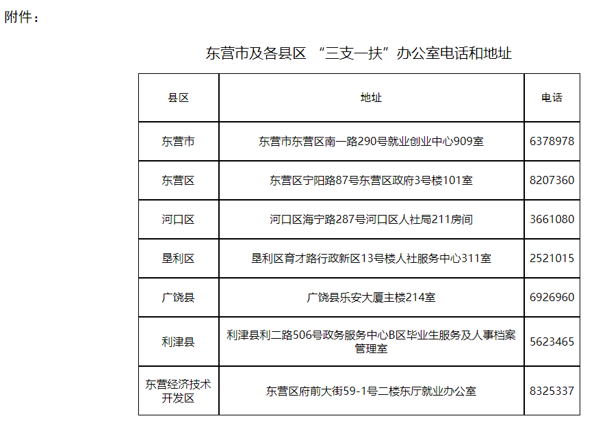 附件:東營(yíng)市及各縣區(qū)、開(kāi)發(fā)區(qū)“三支一扶”辦公室電話和地址