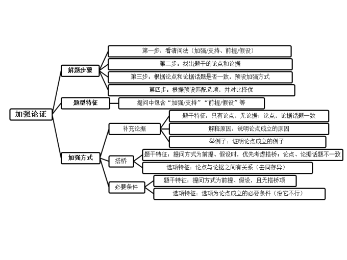 (1)看清問法:問“加強/支持”,即為加強題目;問“前提/假設(shè)”,優(yōu)先考慮搭橋,其次考慮必要條件。