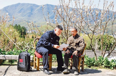 近年來,各地公安機(jī)關(guān)踐行新時代“楓橋經(jīng)驗”,創(chuàng)新開展“背包警務(wù)”等工作模式,為基層群眾排憂解難,推動矛盾糾紛化解。圖為2025年3月21日,浙江省余姚市公安局梁弄派出所民警通過“背包警務(wù)”進(jìn)村入戶,開展安全防范宣傳。新華社記者 江漢/攝