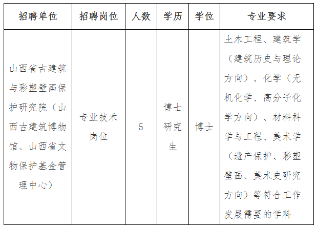 山西省古建筑與彩塑壁畫保護(hù)研究院(山西古建筑博物館、山西省文物保護(hù)基金管理中心)2025年公開招聘博士研究生5名,均為專業(yè)技術(shù)崗位。招聘崗位所需的具體條件見下表: