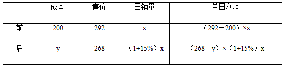 根據(jù)前后單日利潤(rùn)相同列等式,所以有:(292-200)×x=(268-y)×(1+15%)x