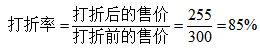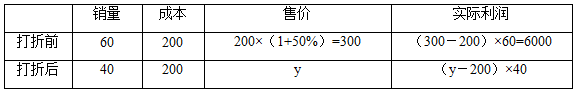 根據(jù)題干所給“售完全部桌椅后,實(shí)際利潤(rùn)比期望利潤(rùn)低了18%”,可得:6000+(y-200)×40=(300-200)×100×(1-18%),解得y=255。根據(jù)打折率的基本公式: