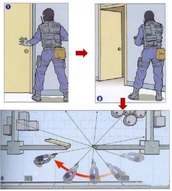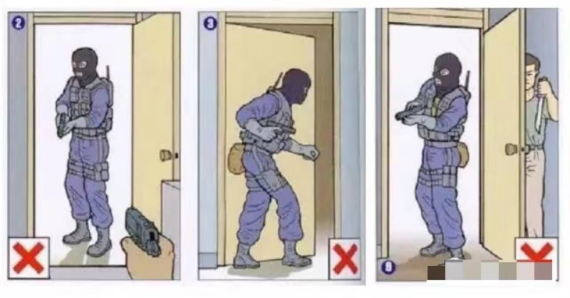 在確認(rèn)視角范圍內(nèi)無威脅后再進(jìn)入,進(jìn)入后迅速掃視在屋外的死角位。