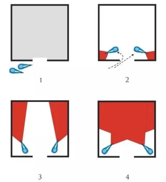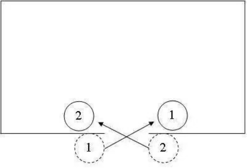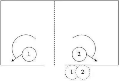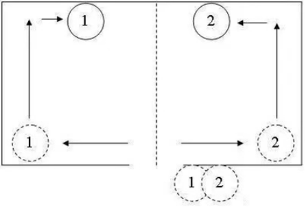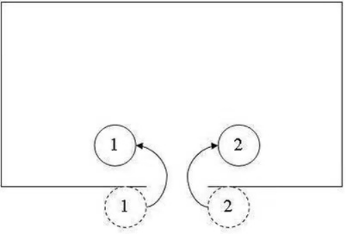 房間形狀對戰(zhàn)術(shù)影響極大。舉個例子的,兩名戰(zhàn)士從同側(cè)進(jìn)入屋內(nèi)。當(dāng)房屋形狀是對稱時,推薦的戰(zhàn)術(shù)流程如下: