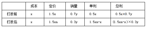 【解析】答案:D。期望獲得50%利潤,也就是利潤率是50%,設(shè)成本為x,定價為1.5x,銷掉70%的商品,又提到數(shù)量,設(shè)總數(shù)為y,銷掉0.7y,還剩0.3y,商店打折出售,設(shè)打折率為n,則打折后的售價為1.5xn,最后一個條件又提到利潤,所以還需要表示出利潤,以定價出售單件利潤為1.5x-x=0.5x,則定價出售的總利潤為0.5x×0.7y,打折后的單件利潤為1.5xn-x,打折后總利潤為(1.5xn-x)×0.3y。最終告訴我們按照所獲得的全部利潤是原來所期望利潤的82%,期望的利潤即在所有商品定價下獲得的利潤,也就是0.5xy。