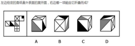 折紙盒題目,第一步永遠(yuǎn)是相對(duì)面排除法,想必小伙伴們對(duì)于怎么找相對(duì)面已經(jīng)很清晰了,這道題也不能用相對(duì)面排除選項(xiàng),我們就直接進(jìn)行下一步吧!