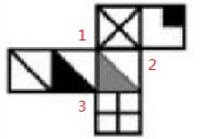 此時(shí)我們看到,題目每個(gè)選項(xiàng)都是要兩個(gè)三角形和×這三個(gè)面相連的關(guān)系,根據(jù)剛剛標(biāo)的點(diǎn),是1連接了這三個(gè)面,所以應(yīng)該在黑三角圖中位置方向的右上角,灰色三角圖中位置的左上角,×面的任意位置,根據(jù)這三個(gè)位置鎖定答案D。