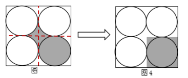 一部分是內(nèi)部小圓的面積,一部分是四個(gè)圓中間形成的陰影部分面積,單獨(dú)求解四個(gè)圓中間形成的陰影部分面積不好求解,可連接正方形四邊的中點(diǎn),因四個(gè)圓兩兩相切,則中線必過切點(diǎn)且與正方形的邊形成四個(gè)邊長為2cm的小正方形,且每個(gè)圓均與小正方形相切(如圖),此時(shí)中間陰影部分被分成四個(gè)面積相等的小部分,再將四個(gè)小陰影部分稍作旋轉(zhuǎn),均放在一個(gè)小正方形中(如圖4),此時(shí)陰影部分的面積就變成小正方形的面積2×2=4(cm2),故答案選A。