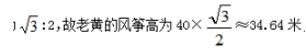【答案】B。解析:根據(jù)題意,老王的風(fēng)箏與地面成30°,則風(fēng)箏高與風(fēng)箏線長之比為1:2,故風(fēng)箏高度為