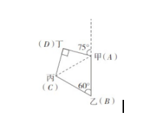 例2:甲、乙、丙、丁四人通過手機的位置共享,發(fā)現(xiàn)乙在甲正南方向 2千米處,丙在乙北偏西 60°方向 2 千米處,丁在甲北偏西 75°方向。若丁與甲、丙的距離相等,則該距離為: