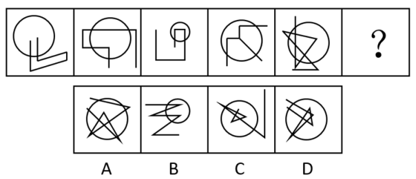 此題有機(jī)構(gòu)這么分析:元素組成不同考慮數(shù)量規(guī)律,第一組圖形交點(diǎn)數(shù)量依次為6、10、4,6+4=10;第二組圖形交點(diǎn)數(shù)依次為5、11、?,因此問號(hào)處填一個(gè)6個(gè)交點(diǎn)數(shù)的圖形,答案選A。嗯,等等,考慮對(duì)稱軸的話,選D好像也說得通啊。對(duì),這題是爭(zhēng)議題!