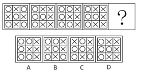 例5:從所給的四個選項中,選擇最合適的一個填入問號處,使之呈現(xiàn)一定的規(guī)律性:
