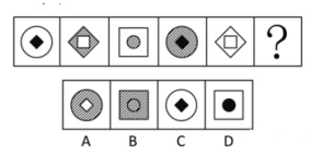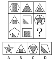 同樣的,此題不看選項,硬看圖形推,很難,且易誤入歧途??催x項怎么做?前一幅圖形內(nèi)部的圖形變?yōu)榈诙鶊D形的外部圖形,排除AC。剩下BD,是不是圖案不同?你剛想說內(nèi)外圖案不一致,被題干5圖打臉。但是失敗是成功之母,你又發(fā)現(xiàn)了,內(nèi)圖的圖案依次是黑、白、陰影~~恩....很隱蔽的遍歷,就是它了,B