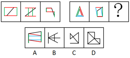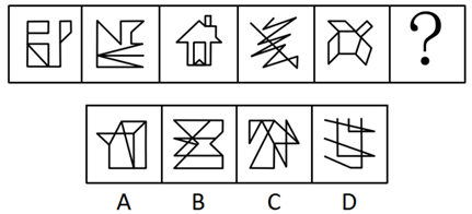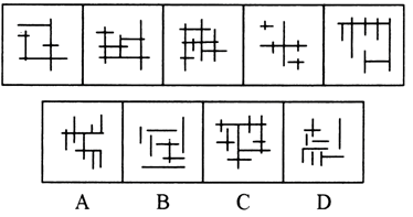 元素組成不同,且無明顯的屬性規(guī)律,考慮數(shù)量規(guī)律。觀察發(fā)現(xiàn)題干中圖形均由橫豎線組成,優(yōu)先考慮直線數(shù),整體觀察無規(guī)律,細(xì)化觀察圖形的豎線的數(shù)量依次遞增,分別為2、3、4、5、6,因此,?處應(yīng)該填入有7條豎線的圖形,A、B、C、D四項(xiàng)豎線的數(shù)目依次為7、4、5、6,只有A項(xiàng)符合。