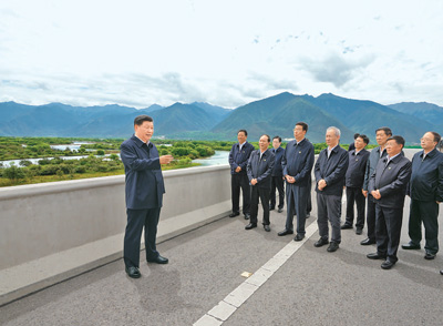 21日上午,習(xí)近平在林芝尼洋河大橋考察雅尼
