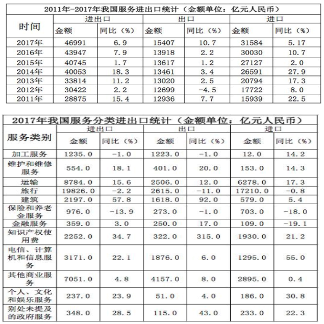 D.2017年我國服務(wù)進(jìn)出口中,別處未提及的政府服務(wù)進(jìn)出口占比最小