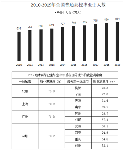 1979年全國普通高校畢業(yè)生人數為8.5萬人,1980年為14.7萬人,2001年為114萬人,2002年為145萬人,2010年較上一年同比增長3.4%,2018年首次突破了800萬人,2019年預計達到834萬人,畢業(yè)生就業(yè)創(chuàng)業(yè)面臨嚴峻形勢。