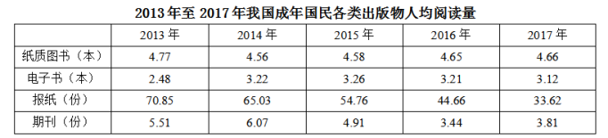 2017年我國(guó)成年國(guó)民圖書(shū)閱讀率為59.1%,比上年增加0.3個(gè)百分點(diǎn);報(bào)紙閱讀率為37.6%,比上年降低2.1個(gè)百分點(diǎn);期刊閱讀率為25.3%,比上年增加1個(gè)百分點(diǎn)。