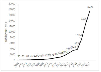 圖1 2000-2017年中國(guó)人工智能專利授權(quán)情況(單位:件)